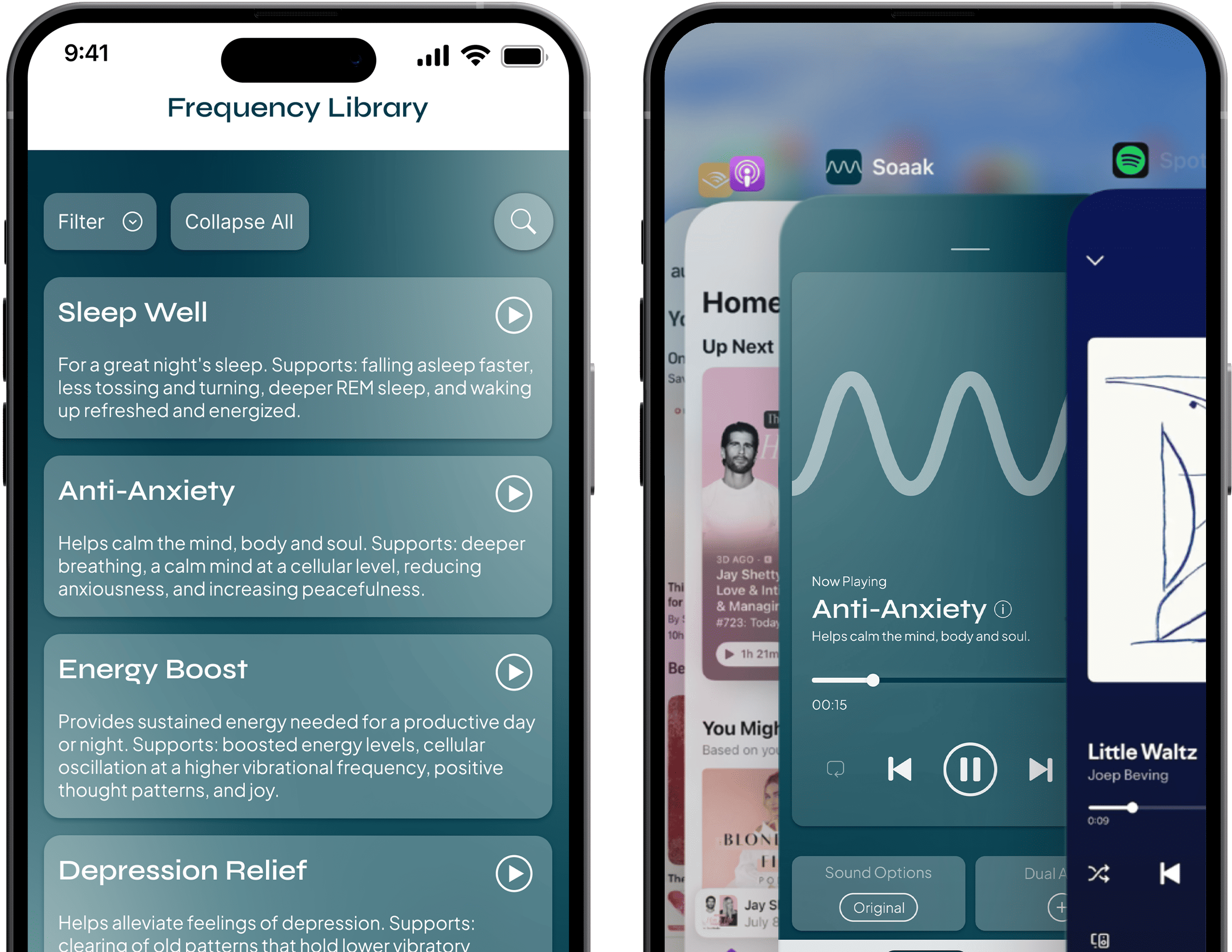 Many users incorporate Soaak into their daily routines – for better focus at work, to enhance meditation, and to improve sleep quality. The frequency compositions can be played at low or moderate volume in the background using our dual audio feature and do not require active attention to be effective.
